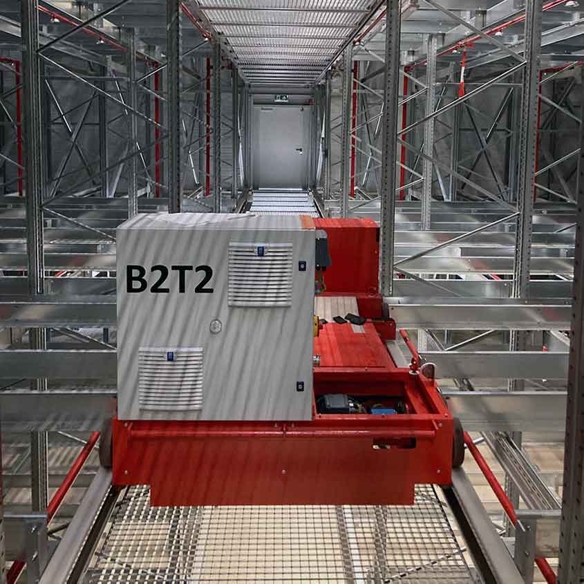 In jeder Ebene fahren 1-2 Bediengeräte mit jeweils aufgesetztem Shuttle und können zeitgleich Ein-, Um-, und Auslagerungen vornehmen. Die Paletten werden dabei in mehrfach tiefe Kanäle hintereinander eingelagert. Tiefkühltauglich bin -30°C, zuverlässiger 24/7-Betrieb.